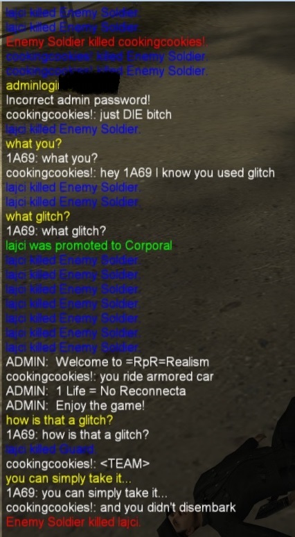 First today she accused me of using a glitch because the server is bugged (also adminlogin not working, even after I restarted the server) and apparently she saw me in a halftrack when I was already out (CZ4 - resistance). (screenshot 1)