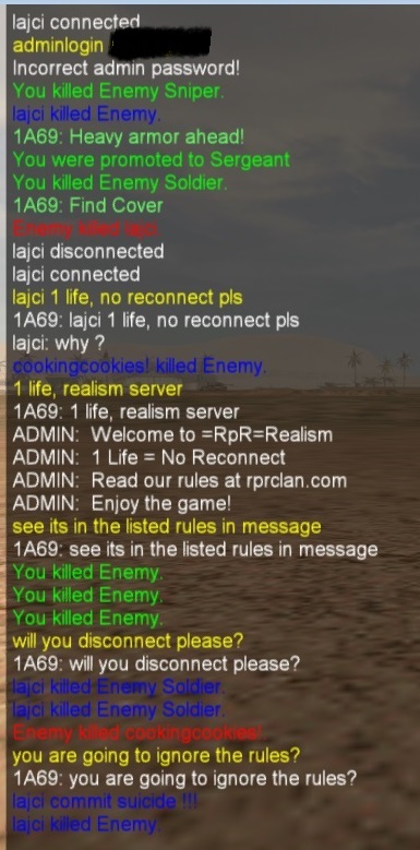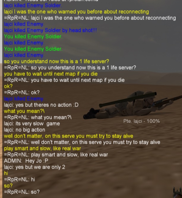 There was also a player Lajci who died and reconnected. Since I never saw this name before I assumed he was a new player and I tried to explain the rules to him. I wanted to do it as admin but could not log in as one as explained. He got killed before I could give him an official warning and/or ban him. (screenshot 3)