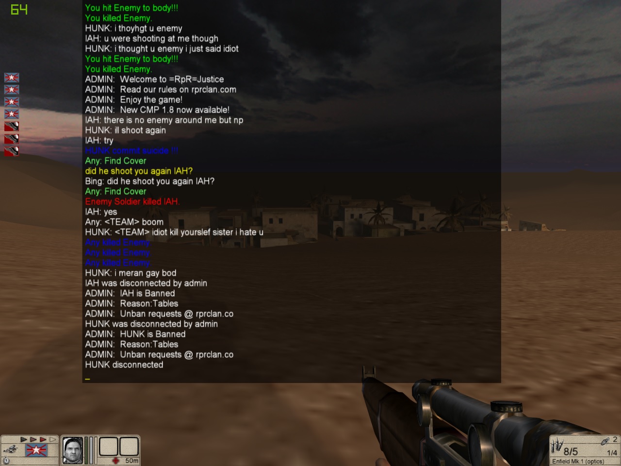 Banned Hunk for team killing on realism. I was almost done on libya 1 but had forgotten camera, he joins, we say hi, he follows me to camera and shoots me in the back. He was already banned for TK and insulting a