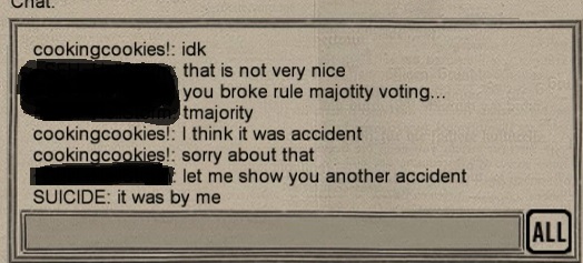 I don't know player SUICIDE but cookingcookies! should know better, she has been explained our rules many times now, also again with the hypocritical response we know from her saying "it was an accident"...like you type voteyes by accident...