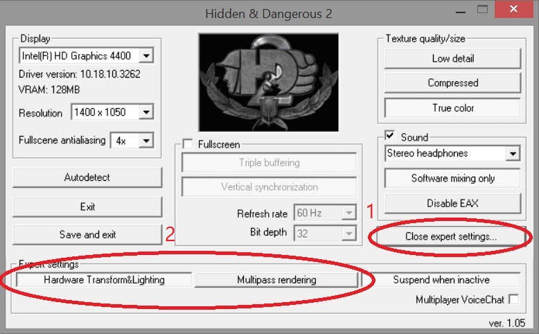 Open the expert settings (bottom right) and switch between "Hardware Transform&Lighting" and "Multipass Rendering" (see screenshot) and test it to see if the game looks better.