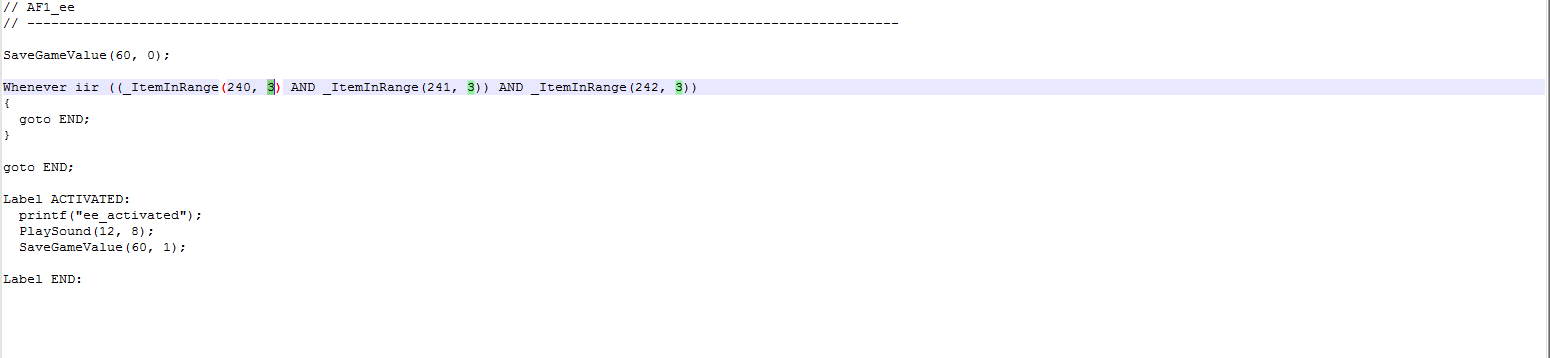Also you have to replace the first "Goto end;" with "goto ACTIVATED;" otherwise if the keys are in range the script jumps to the bottom and the "activated" label is left out.