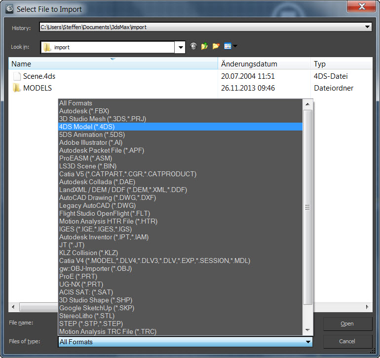 If you now start 3ds Max you can simply use the in-build import function. Make sure you select the right format (4ds, 5ds, bin, klz)