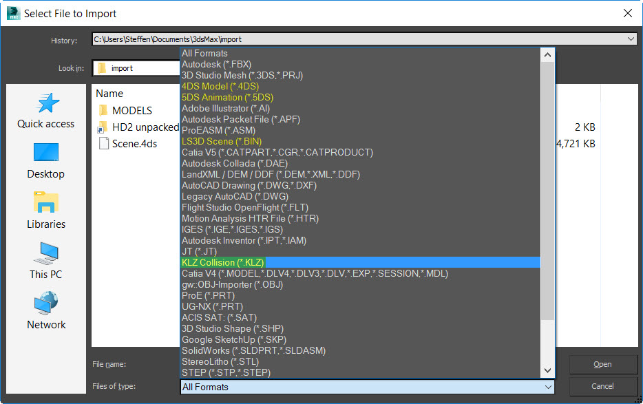 You can import 4ds, parts of tree.klz, actors/scene2.bin (not displayed but selectable), check2.bin