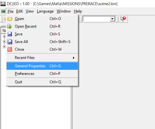 Open the file "scene2.bin" the mission we need and go to the general properties: File --> General Properties , or press Ctrl G