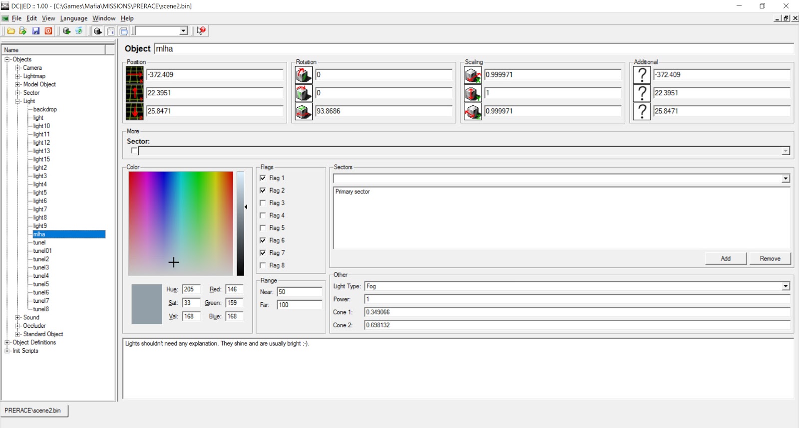Using the same DCED, we reopen the "scene2.bin" file of the mission we want and look for the above light: Will only have to edit the distances (Range) - "Near" and "Far", which are indicated as a percentage in relation to the maximum viewing distance. When I increased it to 600 meters, the fog effect also moved away from the player’s camera and became almost imperceptible. How it works can be seen in the following figure: By this logic to get the initial effect of the fog, its parameters should also reduce the distance twice: