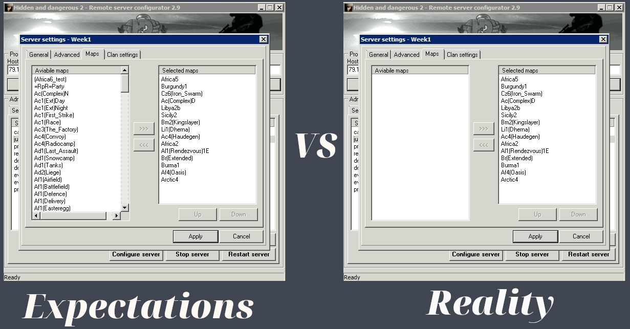 Recently I was testing the classic VTM mod on our servers, trying to make sure everything works fine before I make the announcement. This mod contains 46 missions. Unfortunately, we can't add more than ~30 missions to our mpmaplist. After many hours of testing, it has been found that the Server Manager 2.9 is no longer able to display the maps in the list it reads from the mpmaplist.txt, unable to read when the size of the document has more than 11.800 lines. I've removed the VTM missions, and tested with coop and other style, making sure everything is correct and no errors are made. Every time a mission/ map is added beyond this 11.8K lines, the Server Manager 2.9 no longer displays the missions. It can only read the ones currently in some maplist, but not able to Add anything. To be more precise: