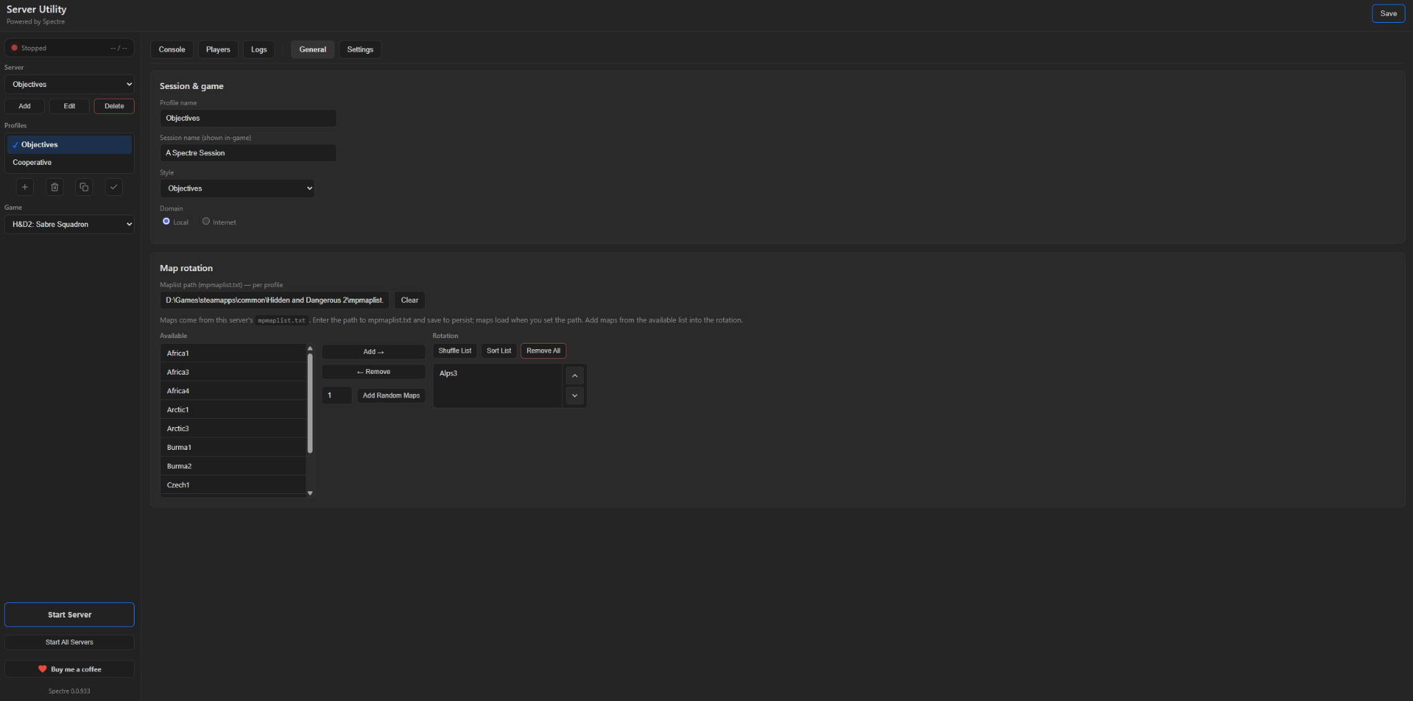Configure servers — Define one or more servers (by port), each with its own profiles: session name, game style, rules, map rotation, passwords, and more. Switch between HD2 and Sabre Squadron per server.