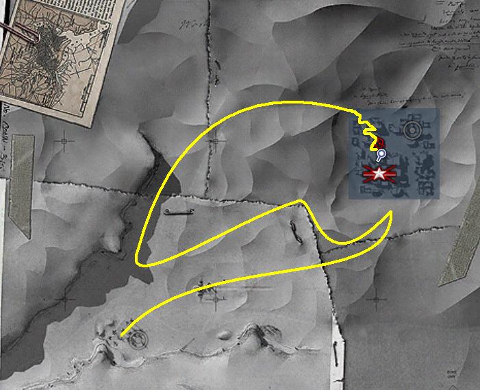 I left the village as quick as possible (yellow line on the map), circled around and came back, killed Panzer on the south side of village and went back to capture the post.