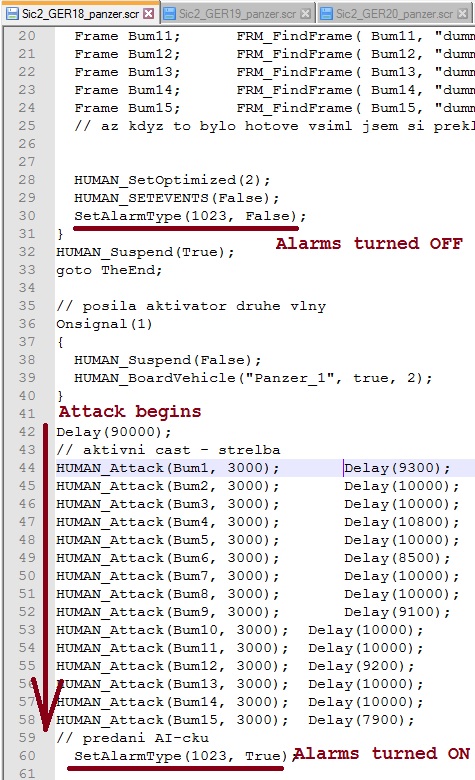 I guess the 2 Panzer tank gunners could have a normal script without shooting at dummy targets and go to alarm from the start, cause their targets are not so important for the objectives.