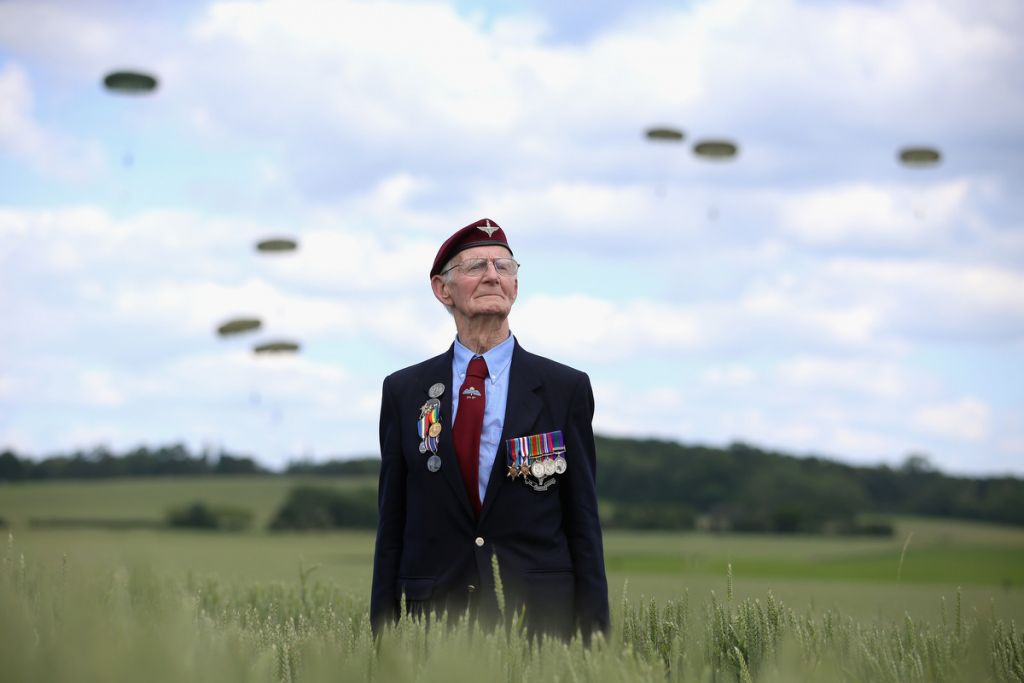 Veteran Fred Glover of the British 9th Parachute Battalion watches a parachute jump during D-Day 70 Commemorations.