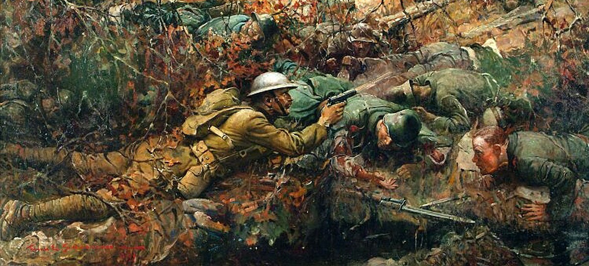 In October 1918, as a newly-promoted corporal, York was one of a group of seventeen soldiers assigned to infiltrate German lines and silence a machine gun position. After the American patrol had captured a large group of enemy soldiers, German small arms fire killed six Americans and wounded three. York was the highest ranking of those still able to fight, so he took charge. While his men guarded the prisoners, York attacked the machine gun position, killing several German soldiers with his rifle before running out of ammunition.