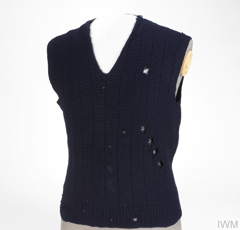 To emphasize the point he orchestrated the successful destruction of the Peugeot factory at Sochaux. Later, during an attempt to evade capture, he was shot four times but still managed to swim across a river and crawl through a forest, eventually getting back to England via Switzerland.This woollen jumper shows where a bullet hole has torn the fabric – and has been darned.