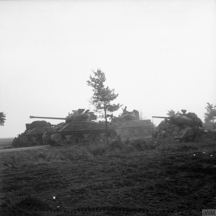 A Sherman Firefly tank of the Irish Guards Group advances past Sherman tanks knocked out earlier during Operation 'Market-Garden', 17 September 1944.