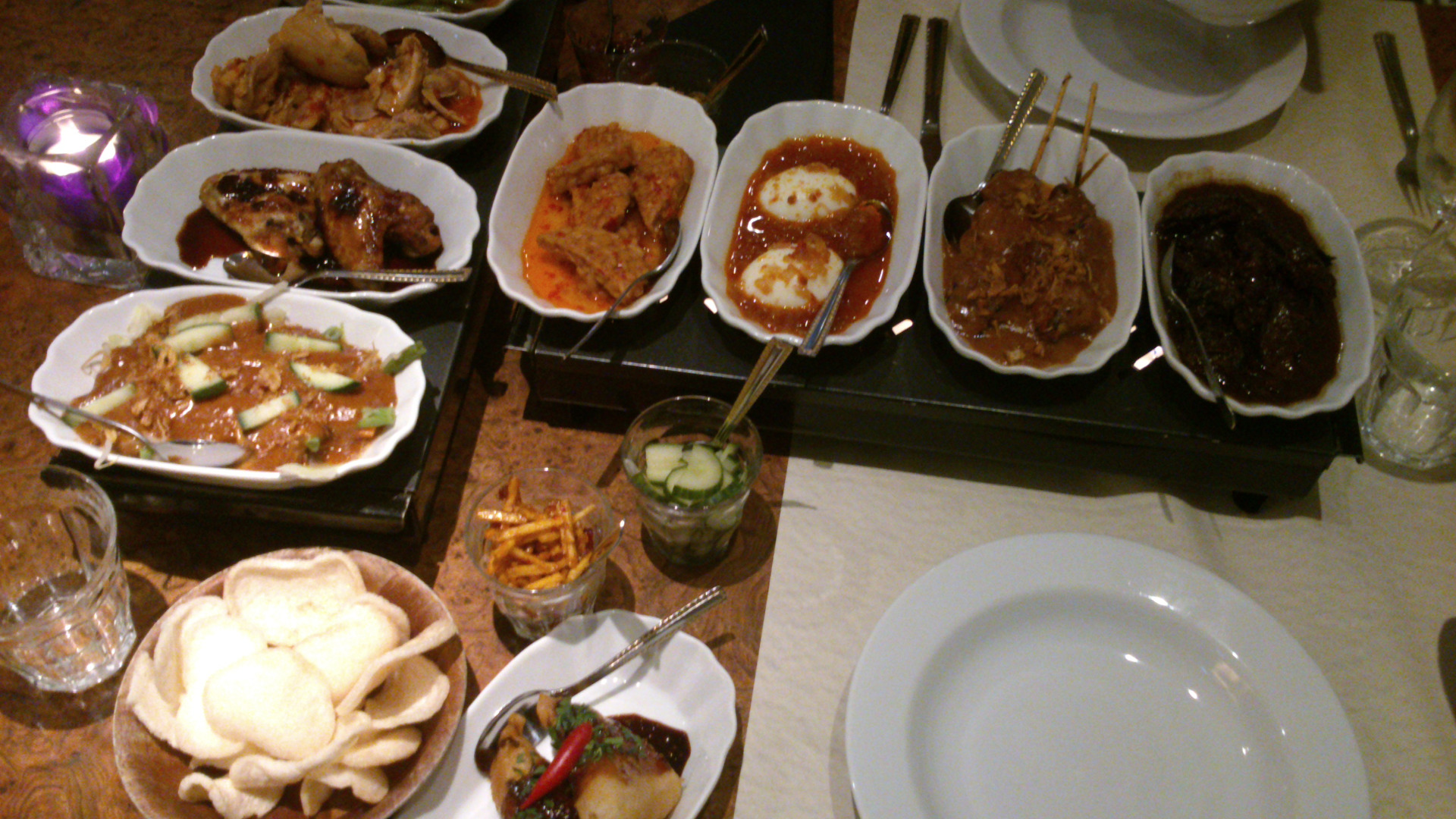 Just came back from a birthday dinner with a lady friend, a very nice Indonesian "rice table", many different dishes, not all in this photo. WAY too much food but very tasty!