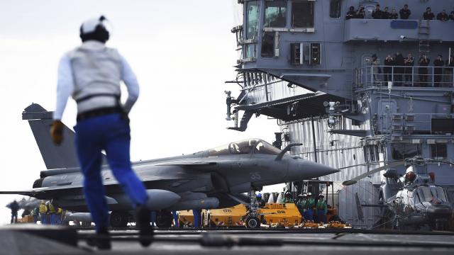 The French task force includes a SSN, a anti-aircraft frigate and a tanker. The first Rafale squad took off on morning, 120 miles off Bahrain.