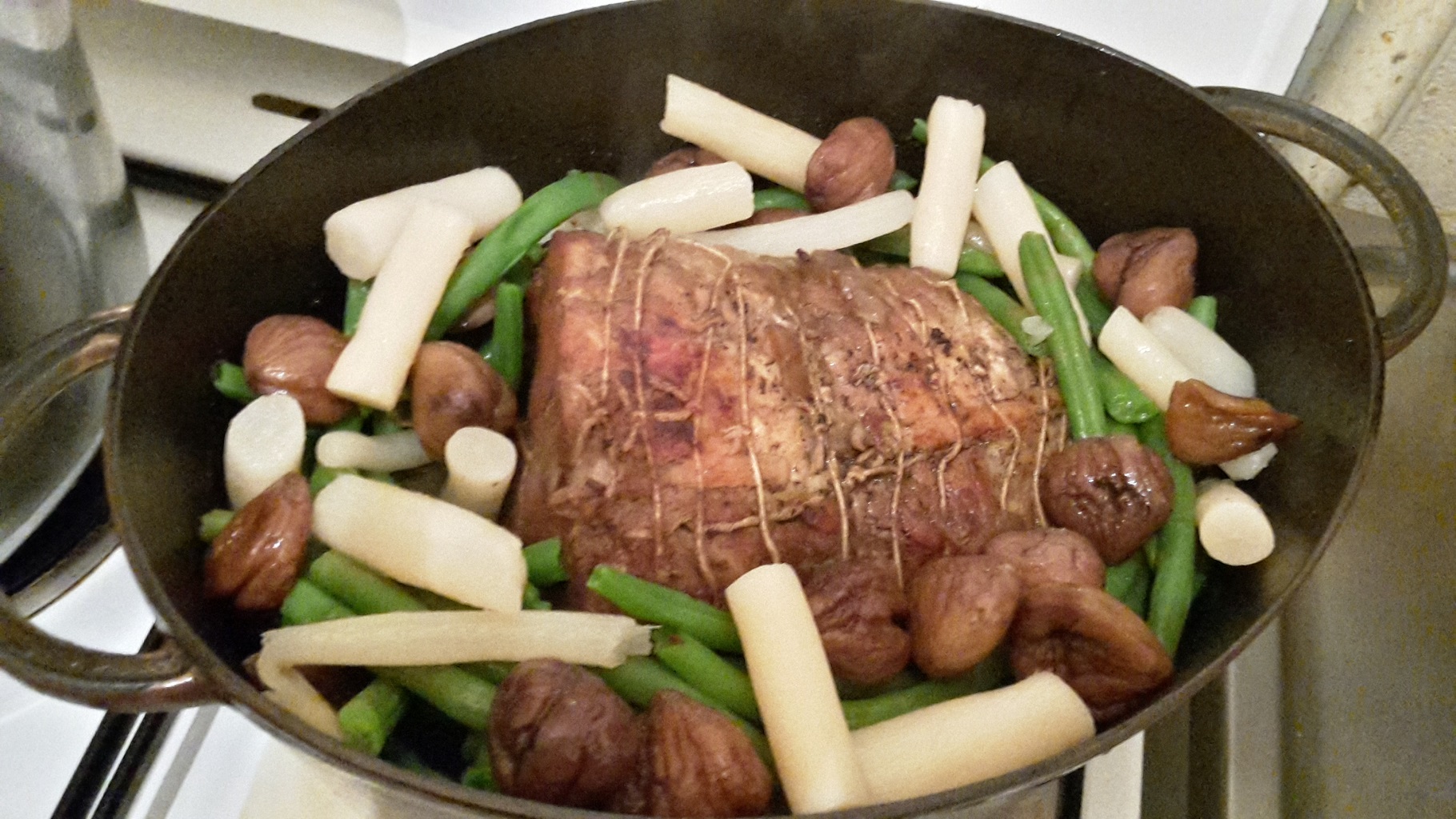 Roast pork cooked in hard cider, green beans, chestnuts and salsify.