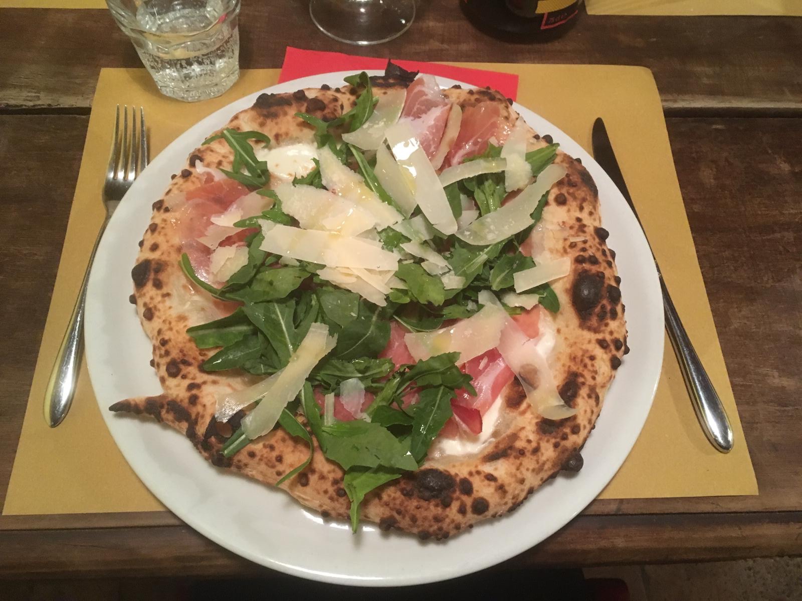 However Flo, sooner or later your pizza should look like this one. I eat it in a farm-pizzeria in Campania, 60 km from Naples. There are Grana cheese flakes, ham and rocket salade. With a homemade beer. Maybe three