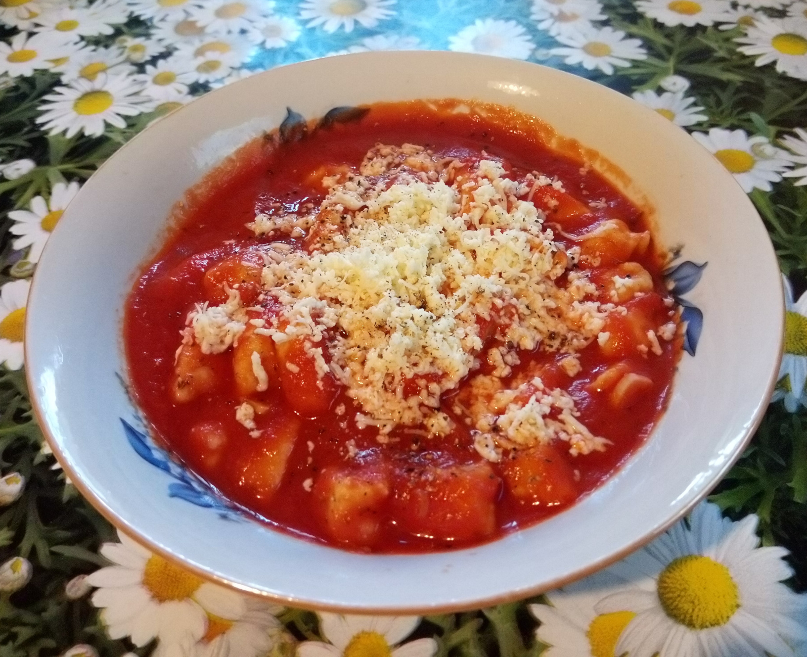 Really enjoyed this simple dish, even if I missed some key ingredients like fresh basil and parmigiano. Adapted with what I had and I suggest not to use passata as I did. This must be a summer dish with fresh tomatoes or sliced ones in a can. I've made half the quantity of gnocchi (described in the video below) and almost the tomato sauce necessary for the full recipe. Simple recipe, done in 30 minutes if you have everything ready.