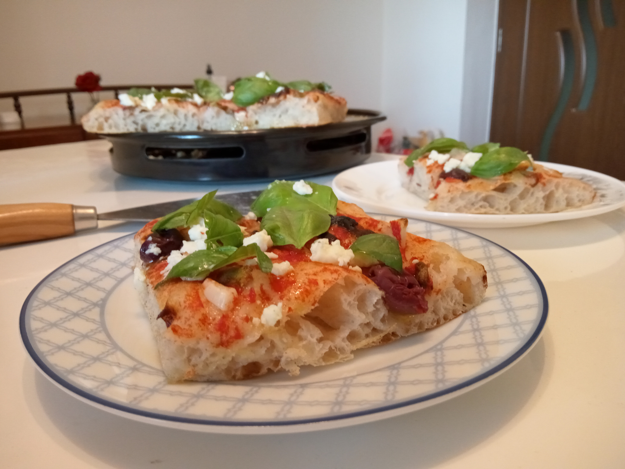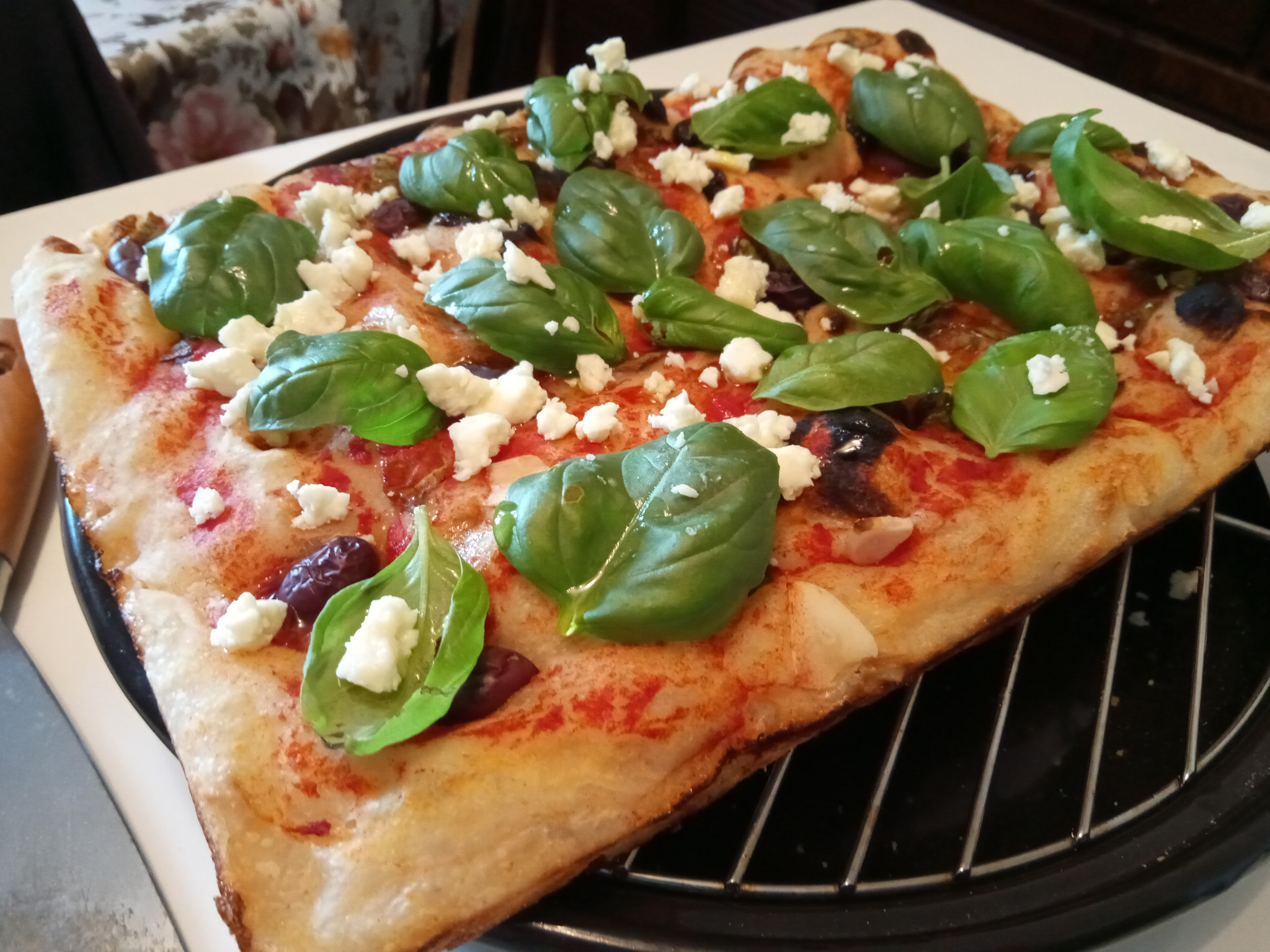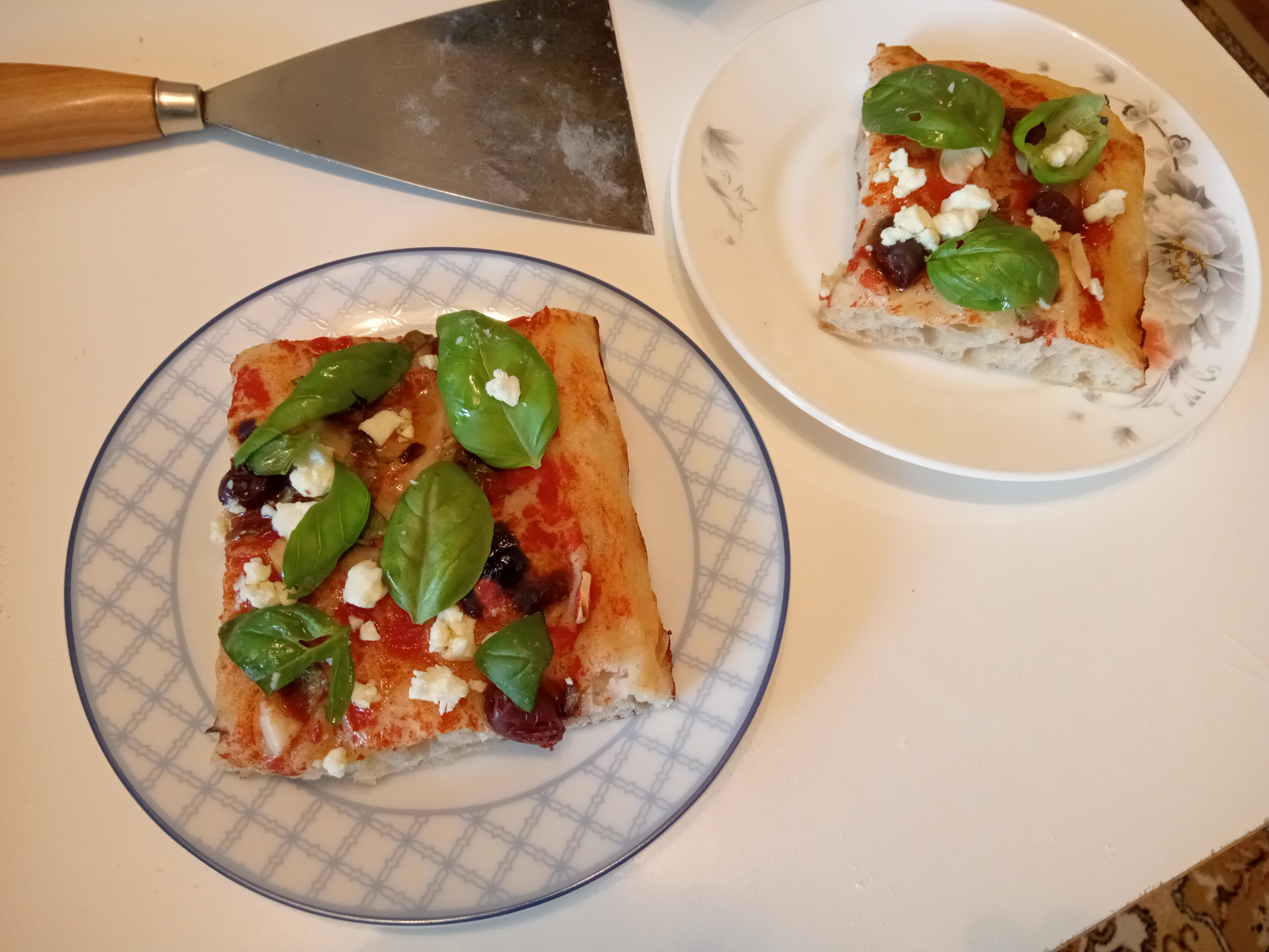 Home made tomato puree, garlic, Kalamata olives, basil, salty sheep cheese and olive oil. Very light. I ate it all except one slice