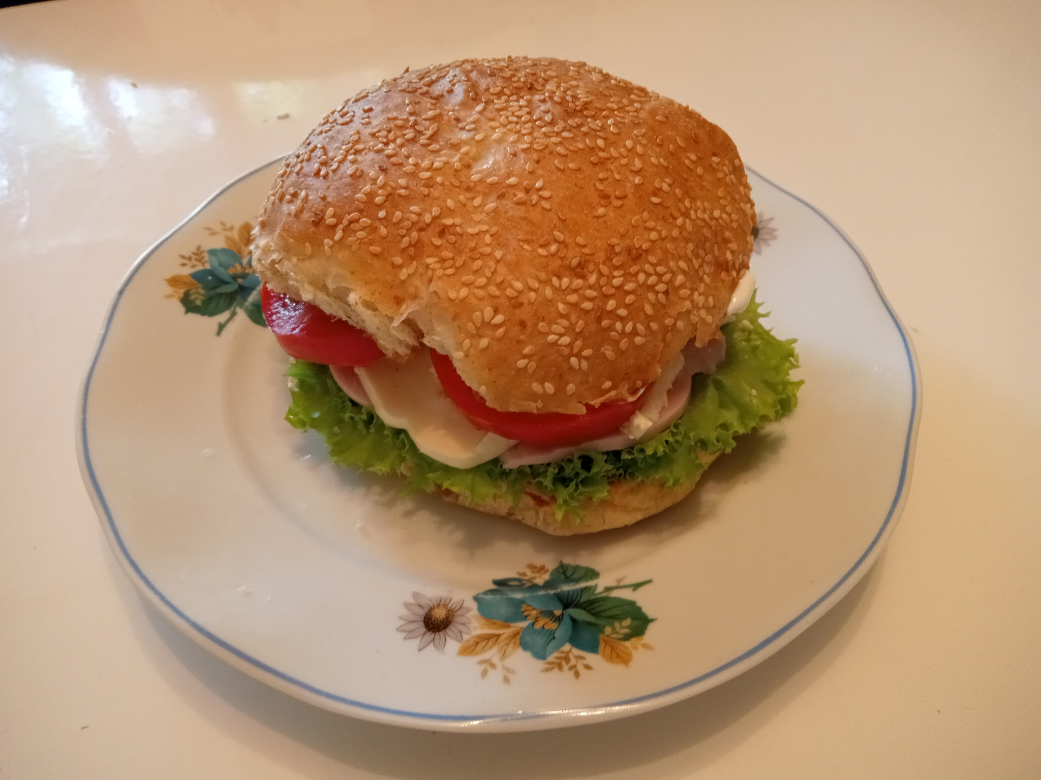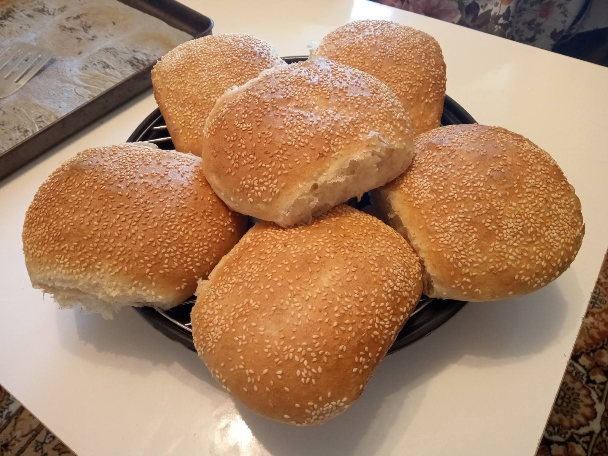 They ended up being a bit flat, but overall I'm satisfied with this being a first attempt. Should've used only 500g of flour and a smaller pan, plus better mixing in order to get smaller, tight, higher balls. The result: tasty airy buttery buns, great eating them plain or with yogurt. What's nice is that you press them down, they come back to the previous shape, unlike bread, which remains... mostly flat.