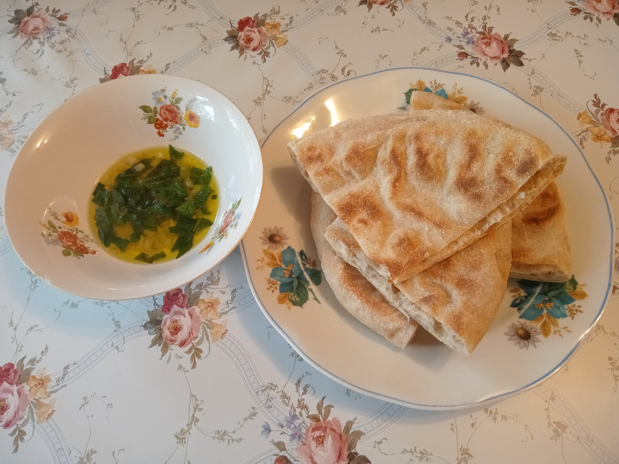 Dip the warm bread into that flavored oil and you need nothing else. I like a glass of milk after this