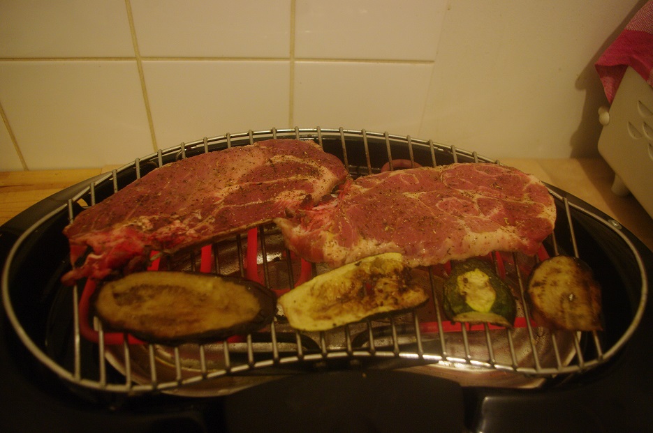 Pork chop "in the backbone", previously marinated in olive oil with salt, pepper and herbs, then grilled on electric barbecue.