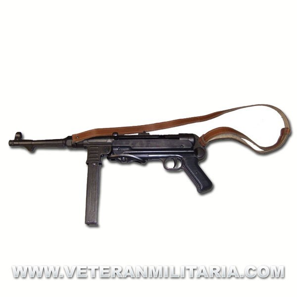 Life-size reproduction of the MP40 submachine gun used by the German army. Made of metal, the handles and sides are plastic, made movements cocking and shooting, folding stock, detachable magazine with belt. Completely unable to play real shot.